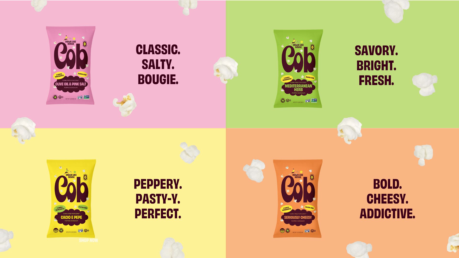 Brought on to lead Cob’s evolution ahead of co-founder Novak Djokovic’s reveal, Second Nature Studio redefined the brand from a corn-free popcorn to a sorghum-based food company founded by a mom + the world’s top athlete. We rebuilt the brand from the ground up, refining its strategy, tone, and creative to meet the standards of an A+ athlete. Our work spans packaging, website, email, campaigns, organic + paid social, events, PR boxes, and merch—shaping a brand that’s witty, craveable, and full of character.